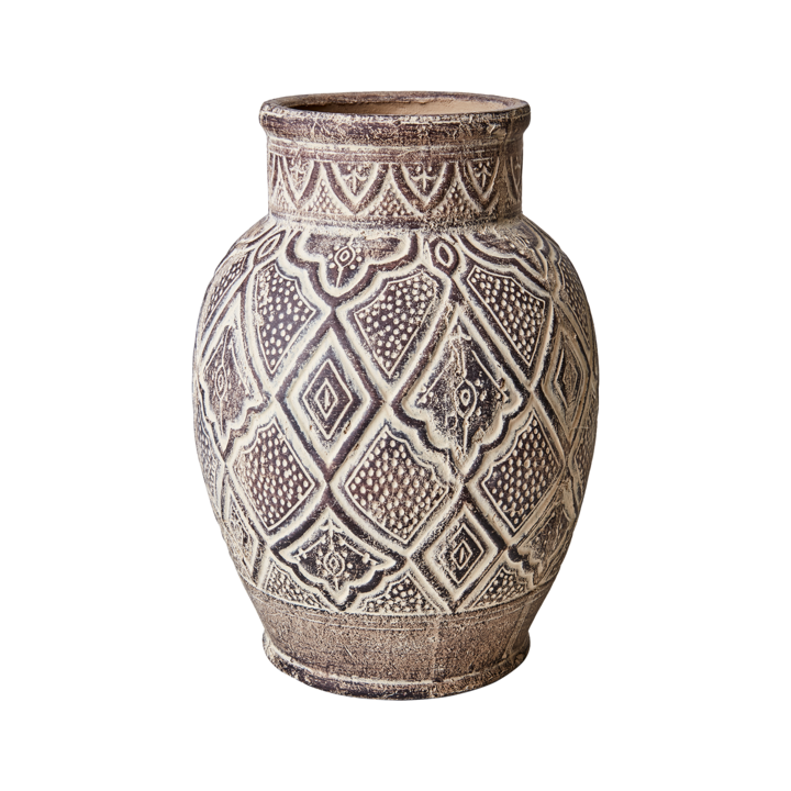 Urna i ljusbrun terrakotta med ett vackert och spännande marockanskinspirerat mönster. Fin att använda som vas till torkade blommor eller dekorationsväxter men är även en vacker inredningsdetalj utan innehåll.
